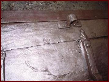Diese Blechfetzentüre aus dem frühen 17. Jahrhundert wurde für einen Kunden aus der Schweiz von uns restauriert und in einem Weinkeller montiert. Die durchgerosteten Blechfetzen wurden ausgetauscht, der Rahmen und die Bänder originalgetreu erneuert und passende Säulen hergestellt. Auf Wunsch des Kunden wurde die Türe schwarz lackiert und silber patiniert. |